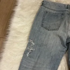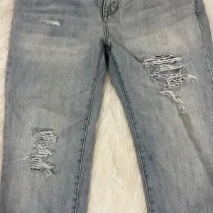 PacSun light wash boyfriend jeans with distressed ripped detailing and a raw hem. These classic jeans offer a comfortable and stylish fit perfect for everyday wear. Ideal for casual outings, weekend brunches, or a relaxed concert.
