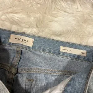 Keywords: PacSun denim, boyfriend fit, distressed denim, ripped jeans, raw hem, light wash, casual style, everyday wear, streetwear, laid-back, comfort jeans, denim trends