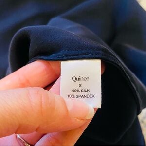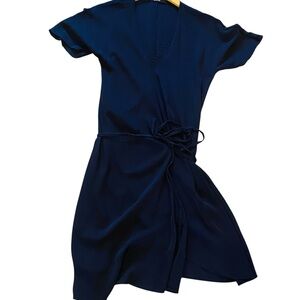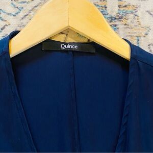 Washable stretch silk wrap dress by Quince. Navy blue. EUC. Size Small measures shoulder to hem 36”, armpit to armpit 18”