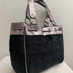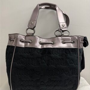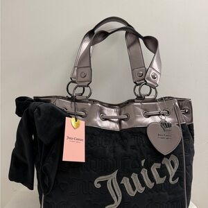New with tags Juicy Couture "Vintage Dreams" daydreamer tote bag. This stylish bag features a black velour body with an all-over embossed Juicy logo and heart pattern. It is accented with gunmetal metallic trim and sturdy shoulder straps.
