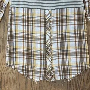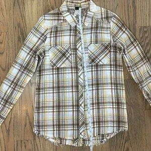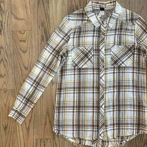 Stylish plaid button-up shirt with a unique pattern on the back. Raw hem.
