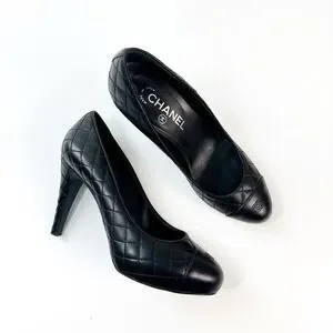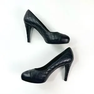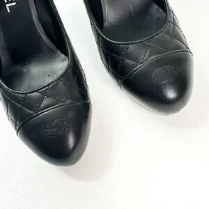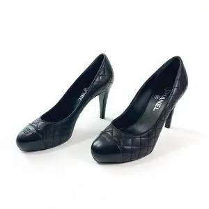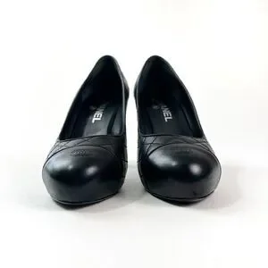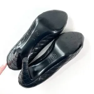 CHANEL Quilted Platform Black Pumps Size 38.5 US 8 CC Logo Heel Cap Toe