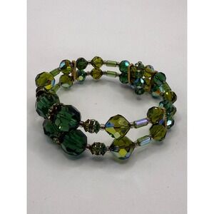 Vintage wired bracelet featuring faceted green crystal beads in varying shades of emerald and olive, accented with gold-tone spacers and small rhinestone details. A bold statement piece that adds a touch of vintage glamour to both casual and dressy looks.
