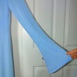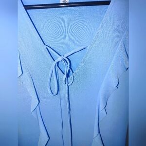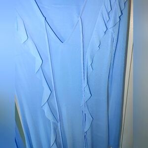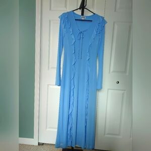 Elegant blue ruffle dress. This dress features a flattering V-neck and long sheer sleeves. The bottom half of dress is sheer also. The rest of dress is lined.