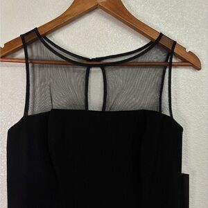 Chic black dress with stylish mesh panels. Designed by Aidan Mattox.
