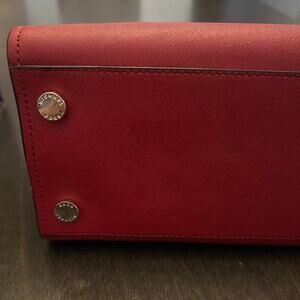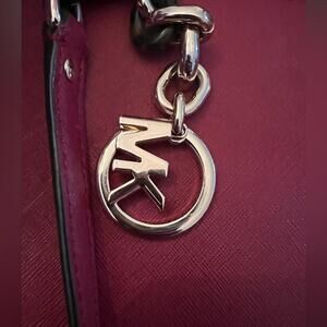 Authentic Michael Kors leather tote purse in a rich burgundy / deep red color with gold-tone chain shoulder straps and signature logo charm.