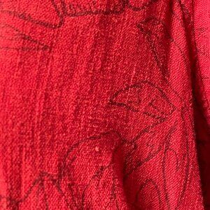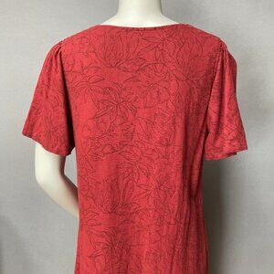Nicole Miller reddish linen-blend shift dress with short sleeves, tiered detail knee length hem, and V-neck. Pull-on style. Subtle Hawaiian pattern with leafy line drawings all over. 53% Linen, 47% Viscose