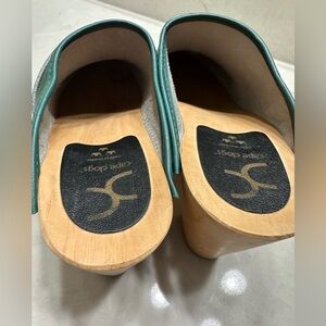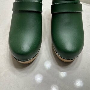 Step out in style with these elegant green leather clogs. Perfect for any occasion, these shoes offer both comfort and fashion. Like new, never worn