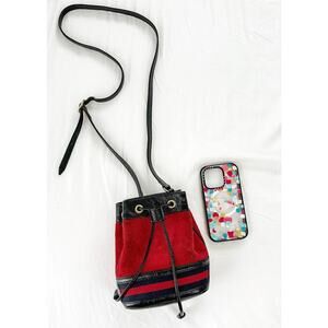 Stunning purse by Gucci is a rare find and truly special! Red suede exterior with red and navy ribbon around the bottom and black patent leather throughout. Drawstring bucket style with adjustable shoulder/crossbody strap. Gold hardware accents.