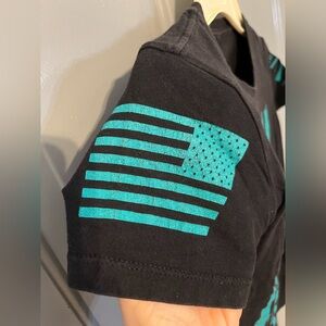 Bold black tee with teal flag graphic. Comfortable and stylish for everyday wear.