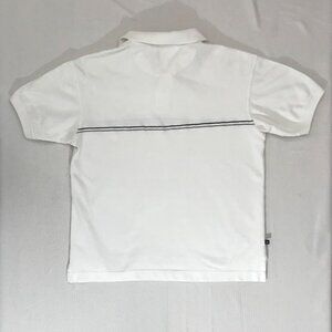 GAP men’s polo shirt in white with a dark chest stripe. Heavyweight 100% cotton, made in USA of imported fabric. Tagged XS but fits oversized/relaxed—see measurements. Excellent pre‑owned condition.
