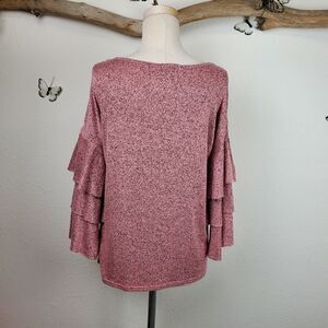 Soft cross between sweater and sweatshirt with oversized dramatic tiered ruffle sleeves. Pink and black heathered pattern. Keyhole accent. Boatneck collar
