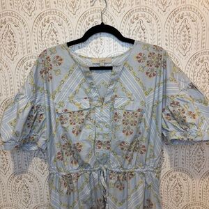 Beautiful LOFT midi dress in a soft light blue with an all-over floral and geometric print. Features a flattering V-neckline, puff sleeves, adjustable drawstring waist, and a flowy tiered skirt. Lightweight and perfect for spring, summer, or casual events.