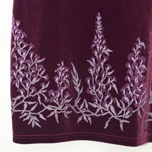 Vintage Y2K IBI burgundy velvet straight pencil skirt with elastic waist and wisteria flower glitter embellishment at the hem. Fabric has some stretch to it. Both sides have a slit that measures 7".
