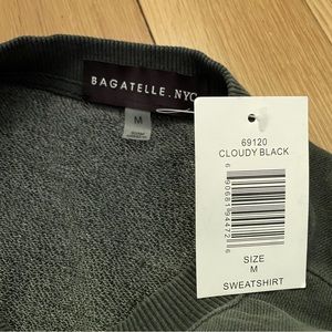 NWT Bagatelle NYC Ruffle Sleeve French Terry Sweatshirt Charcoal Gray - Size Medium. Flirty ruffles add a playful effect to this vintage-inspired washed French Terry sweatshirt. Features a dropped shoulder, cropped length, and v-stitch detail neckline. Oversized silhouette. Ruffles on sleeves. Crew neck. It's comfy enough to wear around the house and cute enough to wear around town. Cotton blend.