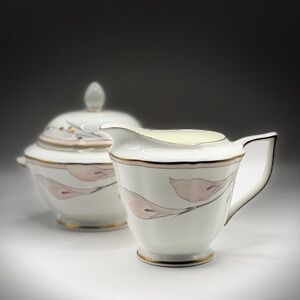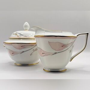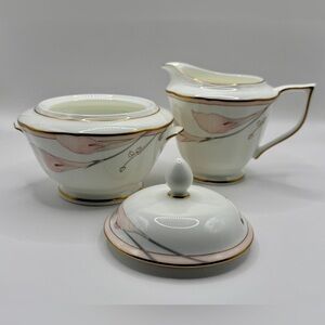 Cream and Sugar bone China set by Mikasa - vintage Bellamy collection. Beautiful glossy off white server-ware with soft pink floral design of delicate lilies. These pieces have scalloped edges with gold trim. DISCONTINUED LINE.