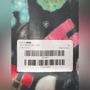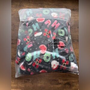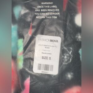 Soft fleece bathrobe with Santa and holiday motifs. Features black, red, green, and white colors. Super soft!! Still in original packaging.