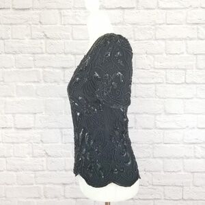 Papell Boutique Evening by Adrianna Papell top in black. It has black beading and sequins all over. It has a short sleeve and a v-neck. It has a scalloped hem and sleeves. There is a zipper and hook and eye closure on the back. It has shoulder pads. Fully lined. This is a vintage piece and might have some missing beads.