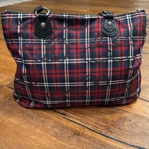 Stylish Coach tote with tartan plaid pattern. Features durable handles and secure zip closure.