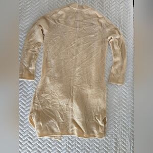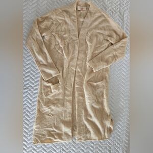 Stay warm and stylish with this cozy cream cardigan. Perfect for layering, this piece adds a touch of elegance to any outfit. Size 1 or small. Good pre-loved condition. Kilte Collection Los Angeles Cashmere neutral tan brown cream long pock cardigan sweater.
