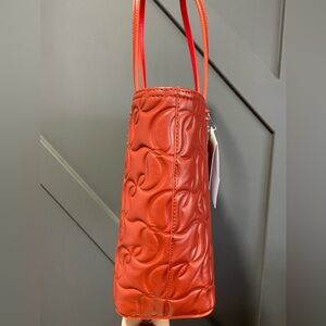 Elegant red designer tote bag with a stylish embossed pattern. Perfect for adding a pop of color to any outfit.