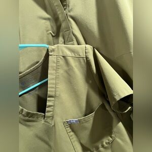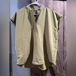 Olive green color. The first images show the most true color. The lighting on the tops is causing it to look a little lighter.