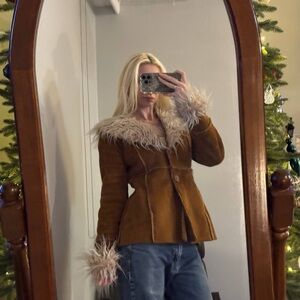 Elegant tan teddy jacket with plush faux fur trim. Perfect for cozy style.