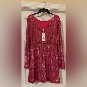 Elegant pink sequin romper with long sleeves. Perfect for formal events.