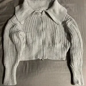 Chic and cozy cardigan with a zip front. Features a stylish collar. Ideal for layering. Gently used condition. Non smoking home.