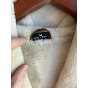 Genuine tan suede lined in faux beige fur. Heavyweight warm coat. Hooded. Faux fur sleeve cuffs. Women's size medium. Some stains on the collar shown in photos and a light mark underarm on the suede. Metal clasp closures in front. Drawstring at waist. 23" pit to pit measured across back laying flat. 28" long.