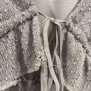 This stylish gray cropped top features a delicate tie-front design and ruffled sleeves, perfect for any occasion.