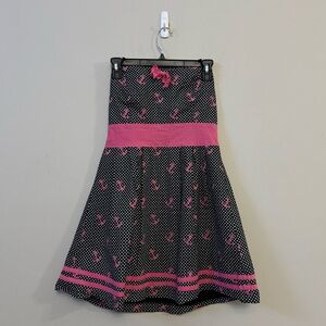 Great pre owned condition Women’s Sourpuss black and white polka dot printed sailor mini rockabilly pinup girl dress. Strapless style with cute sweetheart neckline. Pink anchor details and pink accent detailing. No holes etc