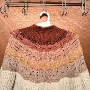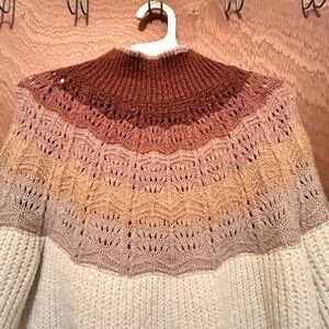 Cozy knit sweater with a stylish turtleneck. Features cream and brown tones. Perfect for cool weather.