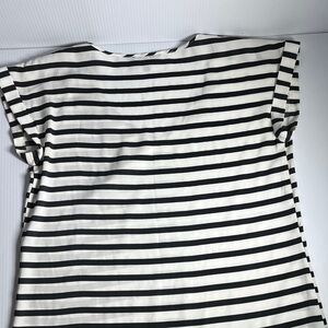 Stylish short sleeve top with bold stripes. Comfortable and trendy design.