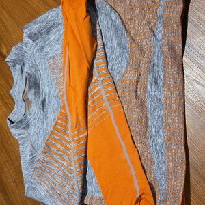 Stylish gray and orange activewear set. Perfect for workouts. long sleeve with thumb holes. no Size marked. ptp unstretched 16. pants 12.5 (15 stretched) stretched. maybe small.