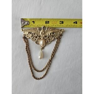 Vtg Gold Tone Large Eagle Dangle Chain Pearl Brooch