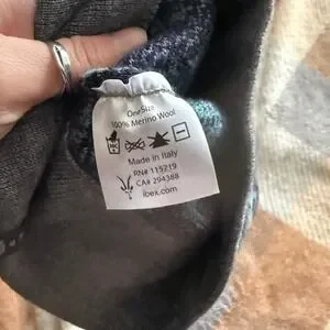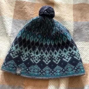 Stylish knit hat by Ibex. Features a blue and gray pattern. Soft and warm with a pom-pom on top.