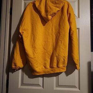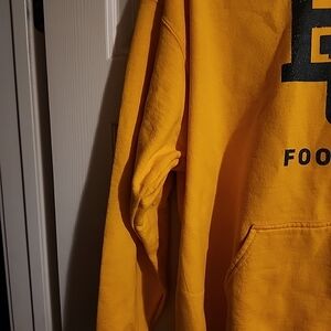 Bold yellow hoodie with front pocket. Features football graphic. Ideal for casual wear.