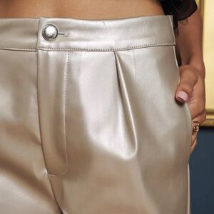 High-waisted, straight leg trousers in a metallic PU fabric. Finished with side seam pockets and a cover button fastening.