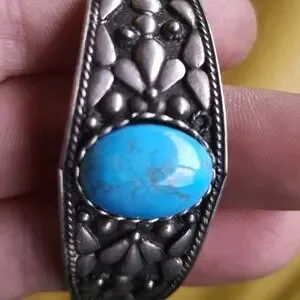 This vintage bracelet features a unique Southwestern style with a Native American design, showcasing a beautiful turquoise cabochon set in sterling silver. The American Vintage brand adds a touch of authenticity and craftsmanship to this piece, making it a stunning accessory for anyone looking to add a touch of ethnic and regional flair to their ensemble. The intricate details and high-quality materials make this bracelet a standout piece of jewelry that is sure to make a statement.