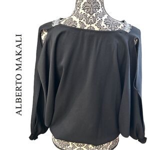 Alberto Makali Women’s Black Tie Front Blouse. Bat sleeves with slits down arms