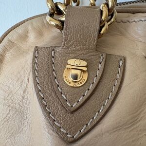 Gorgeous and timeless Marc Jacobs bowler-style handbag crafted from incredibly soft leather. Features quilted leather accents, pleated front design, and luxe gold-tone chain double handles with leather shoulder rests for added comfort.