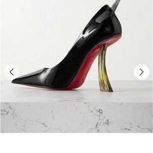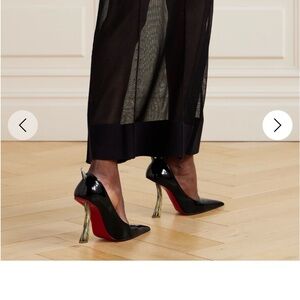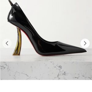 Sleek black patent leather heels. Distinctive gold accent on the heel. Signature red sole - forever sole.