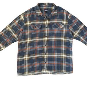 Patagonia blue and orange flannel shirt made with Organic Cotton #outdoorwear #winter #warm