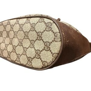 Authentic vintage Gucci GG monogram bucket bag from the late 1970s–early 1980s. Features iconic beige GG canvas with brown leather trim, drawstring closure, and gold-tone Gucci medallion hardware. Made in Italy.