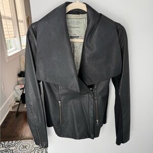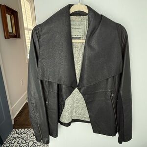 Chic black leather jacket by Cartonnier. Features a stylish open front and sleek design. Perfect for layering.