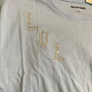 Stylish blue long sleeve tee, cropped embellished top. Features 'LOL' & lighting bolt embellishments. Comfortable and trendy. NWT & Packaging. Please see pictures, note light mark on fabric under the “O”