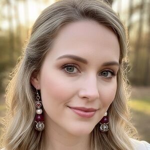 Artisan made with gold plated copper hypoallergenic fishhook ear wires & Beaded with 2 large mineral grade rubies, white glass pearls, glass hearts, & vintage Swarovski crystals. Model image is AI generated.