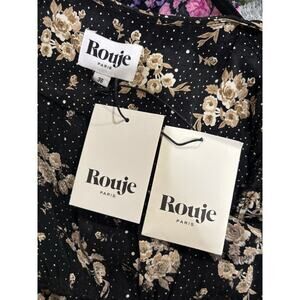 The NWT ROUJE PARIS Rosalie Dress in Noir Imprime Bouquet Mamie is a stylish and versatile dress perfect for various occasions. Made of viscose fabric with a floral pattern, this knee-length dress features a V-neckline, puff sleeves, and button closure. The dress is designed in a classic black color and is care for by dry cleaning only. This Paris-inspired dress is a must-have for any fashion-forward woman looking for a blend of casual and formal style in their wardrobe.