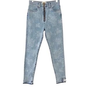 **Style Keywords:** skinny jeans, light wash denim, floral print, zip front, raw hem, high rise, stretch denim, rose print, exposed zipper, ankle jeans